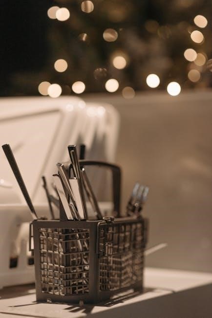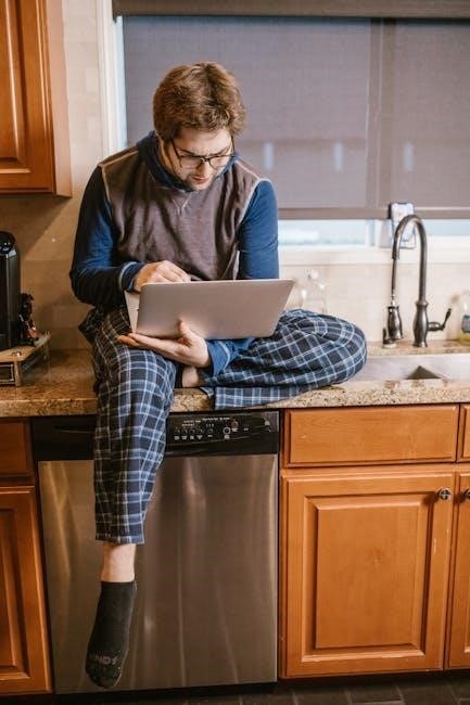 Digital displays often indicate cycle progress, remaining time, and error codes. Touch controls or traditional buttons manage selections. Understanding the indicator lights—such as High Temp, Heated Dry, or Rinse Aid Low—is essential for monitoring the dishwasher’s status. The manual provides a visual guide to each button and display element, ensuring effortless operation. Proper use of these controls guarantees efficient cleaning and extends the appliance’s lifespan.